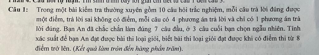 Để đạt loại giỏi (từ $8$ điểm trở lên), An cần trả lời đúng ít nhất $1$ câu trong $3$ câu cuối