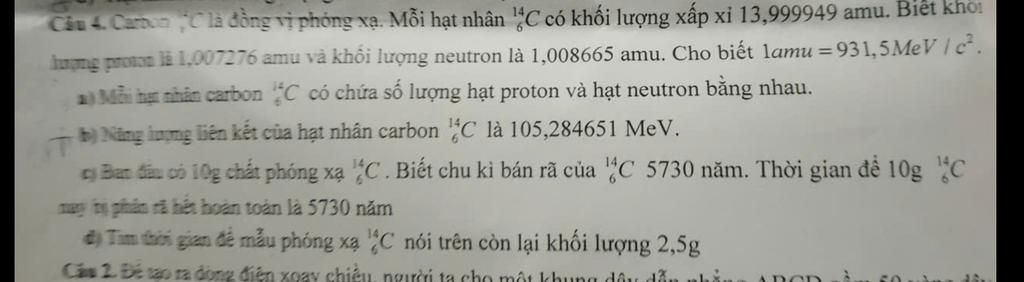 Câu 4: Carbon `¹⁴₆C` là đồng vị phóng xạ. Mỗi hạt nhân `¹⁴₆C` có khối lượng xấp xỉ `13,999949` `am u`. Biết khối lượng proton là `1,007276` `am u` và khối lượng neutron là `1,008665` `am u`. Cho biết `1` `am u` `=` `931,5` `MeV//c^2`.