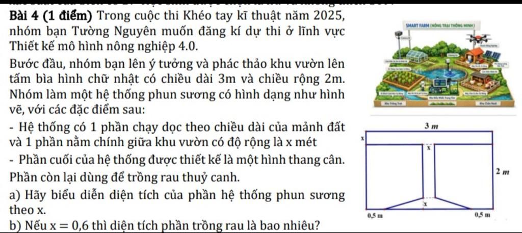 Diện tích hệ thống phun sương khi `x=0,6` là: