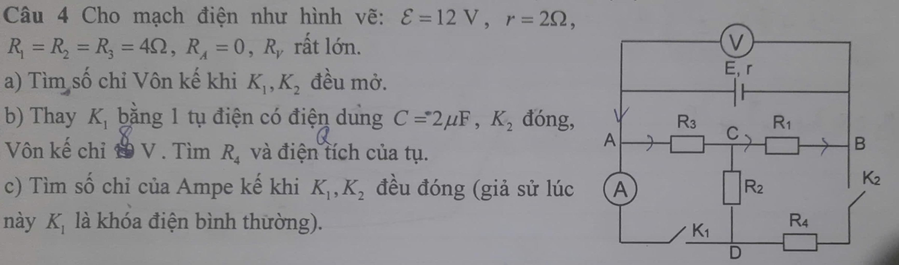 a) Tìm số chỉ Vôn kế khi K,K, đều mở.