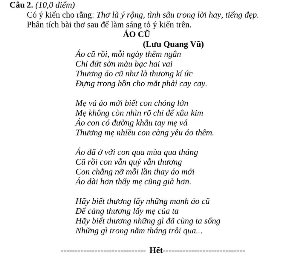 Có thể khẳng định, bài thơ “Áo cũ” của Lưu Quang Vũ là một minh chứng tiêu biểu cho nhận định: “Thơ là ý rộng, tình sâu trong lời hay, tiếng đẹp.” Từ một hình ảnh giản dị, nhà thơ đã gửi gắm những suy tư sâu sắc về thời gian, kí ức và tình mẫu tử, đồng thời thể hiện qua ngôn ngữ tinh tế, giàu nhạc điệu. Bài thơ không chỉ làm giàu thêm cho tâm hồn người đọc mà còn nhắc nhở mỗi chúng ta biết sống chậm lại, biết trân trọng những điều bình dị mà thiêng liêng trong cuộc đời. Rút gọnCó thể khẳng định, bài thơ “Áo cũ” của Lưu Quang Vũ là một minh chứng tiêu biểu cho nhận định: “Thơ là ý rộng, tình sâu trong lời hay, tiếng đẹp.” Từ một hình ảnh giản dị, nhà thơ đã gửi gắm những suy tư sâu sắc về thời gian, kí ức và tình mẫu tử, đồng... xem thêm
