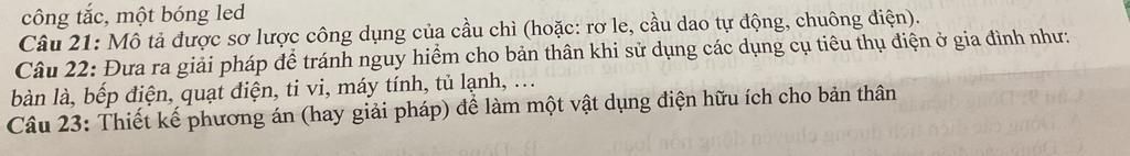 Câu 22: Đưa ra giải pháp để tránh nguy hiểm cho bản thân khi sử dụng các dụng cụ tiêu thụ điện ở gia đình như:
