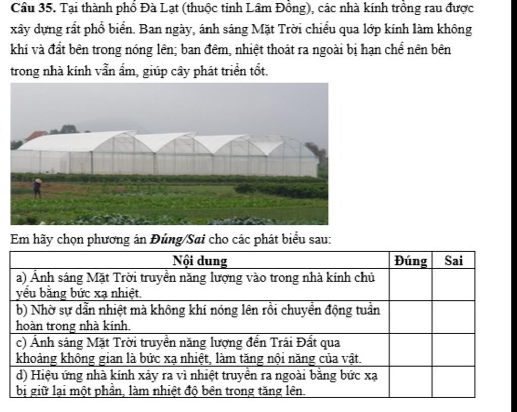 Đây là nguyên lý cơ bản của hiệu ứng nhà kính. Lớp kính cho các bức xạ sóng ngắn (ánh sáng) đi qua dễ dàng nhưng lại ngăn cản bức xạ sóng dài (nhiệt từ đất và câu tỏa ra) thoát ra ngoài, giữ nhiệt lại bên trong.
