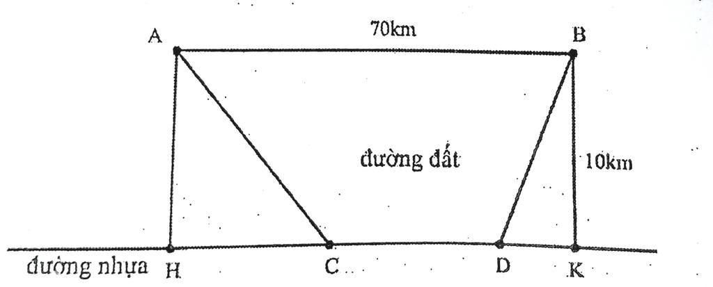 Anh Đông cần đi từ A đến B cách nhau 70 km bằng xe ô tô. Tuy nhiên đoạn đường AB là đường đất nên ô tô chỉ chạy được với tốc độ trung bình 27 km/h. Ở gần khu vực này có một đường nhựa chạy song song với AB, cách AB một khoảng 10 km và trên đường nhựa này ô tô có thể chạy với tốc độ trung bình 45km/h.
