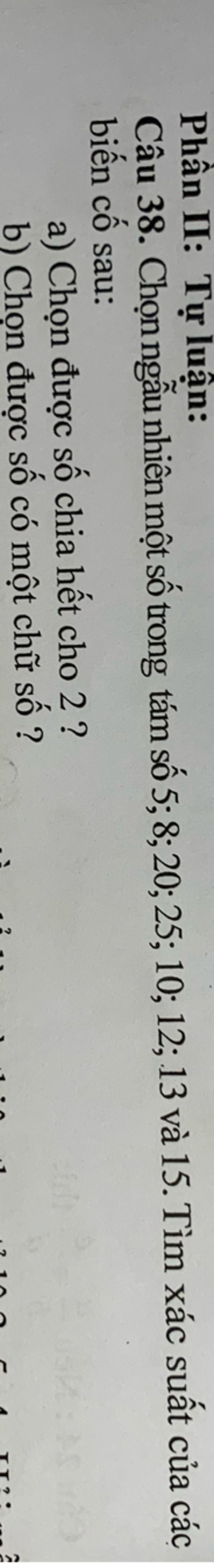 `b)` Có `2` kết quả thuận lợi cho biến cố "Chọn được số có một chữ số" là: `5;8`