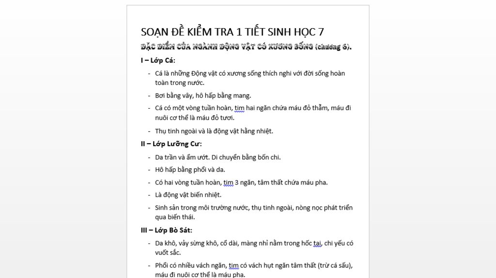 - Lớp bò sát: Bò sát là động vật có xương sống thích nghi hoàn toàn với đời sống ở cạn: da khô, vảy sừng khô, cố’ dài, màng nhĩ nam trong hốc tai, chi yếu có vuốt sắc, phổi có nhiều vách ngăn, tim có vách hụt ngăn tâm thất (trừ cá sấu), máu đi nuôi cơ thế vẫn là máu pha, là động vật biến nhiệt. Có cơ quan giao phối, thụ tinh trong, trứng có màng dai hoặc vỏ đá vôi bao bọc, giàu noãn hoàng.