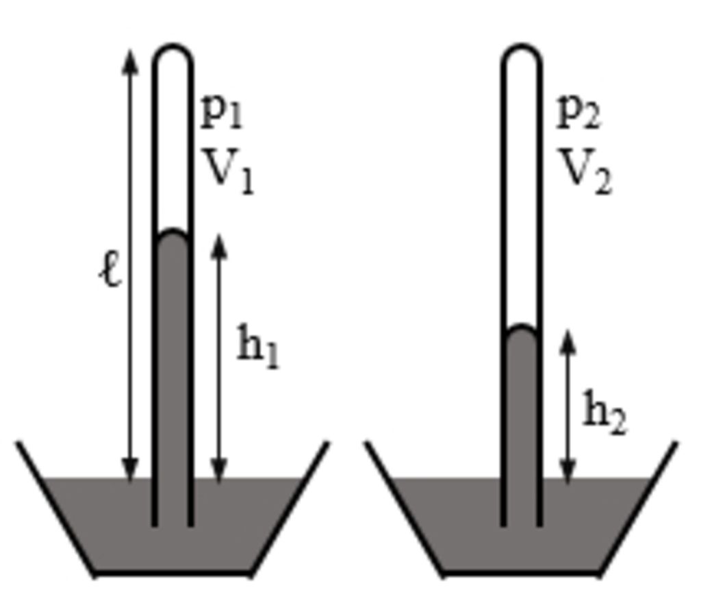 $ \left( {{H}_{1}} \right)\,\,\,\Rightarrow \left\{ \begin{array}{l} {{p}_{1}}={{p}_{o}}-{{h}_{1}}=760-740=20\,mmHg \\ {{V}_{1}}=\left( \ell -{{h}_{1}} \right)s=60\text{s} \end{array} \right. $