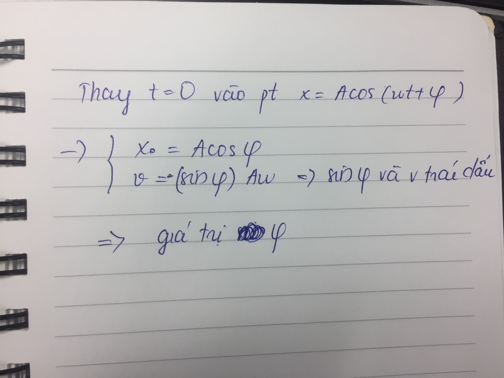 Em có tọa độ và biên độ tìm được cosphi từ đó tính được phi có 2 giá trị, kết hợp với điều kiện sinphi trái dấu với v sẽ loại được một giá trị