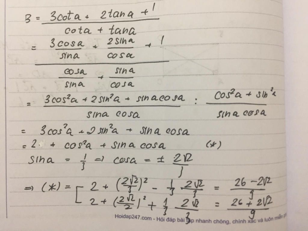 +) \tan a=\dfrac{1}{\cot a}=\dfrac{1}{2\sqrt{2}}=\dfrac{\sqrt{2}}{4}\\
