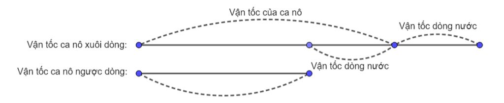 Ta có sơ đồ như hình vẽ, từ hình vẽ ta thấy nếu lấy vận tốc của của ca nô đi xuôi dòng trừ vận tốc của ca nô đi ngược dòng bằng hai lần vận tốc của dòng nước.
