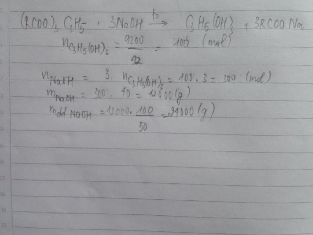 $(RCOO_3)C_3H_5+3NaOH \buildrel{{t^o}}\over\to 3RCOONa+C_3H_5(OH)_3$
