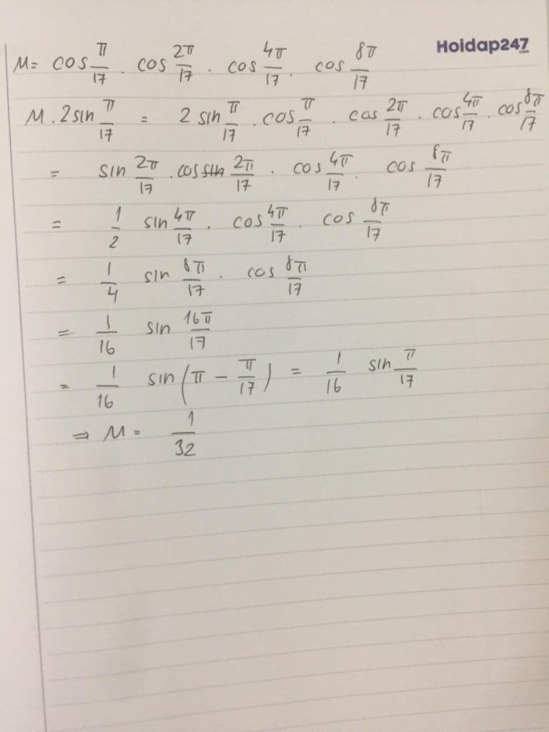 \Leftrightarrow \sin \dfrac{\pi }{{17}}.A = \dfrac{1}{2}.\left( {2\sin \dfrac{\pi }{{17}}.\cos \dfrac{\pi }{{17}}} \right).\cos \dfrac{{2\pi }}{{17}}.\cos \dfrac{{4\pi }}{{17}}.\cos \dfrac{{8\pi }}{{17}}\\