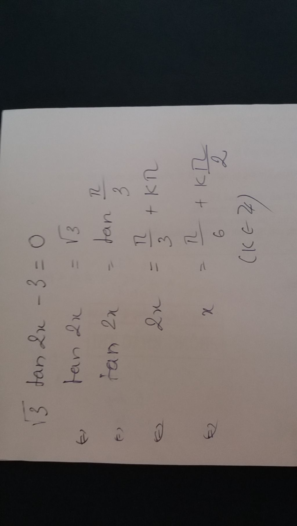 Giải thích các bước giải: \[\begin{array}{l}\sqrt 3 .\tan \,2x - 3 = 0\,\,\,\left( {DK:\,\,\,\,co\,s2x \ne 0 \Leftrightarrow x \ne \frac{\pi }{4} + \frac{{k\pi }}{2}} \right)\\ \Leftrightarrow \tan \,2x = \frac{3}{{\sqrt 3 }} = \sqrt 3 \\ \Leftrightarrow \tan \,\,2x = \tan \,\,\frac{\pi }{3}\\ \Leftrightarrow 2x = \frac{\pi }{3} + k\pi ,\,\,k \in Z\\ \Leftrightarrow x = \frac{\pi }{6} + \frac{{k\pi }}{2},\,\,k \in Z\,\,\,\left( {TM} \right)\end{array}\]