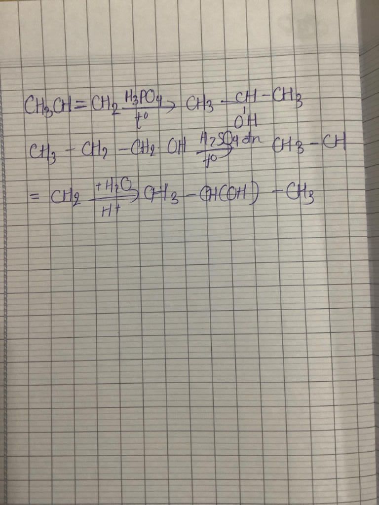 $CH_2=CH-CH_3+HOH\buildrel{{H^+, t^o}}\over\to CH_3-CHOH-CH_3$