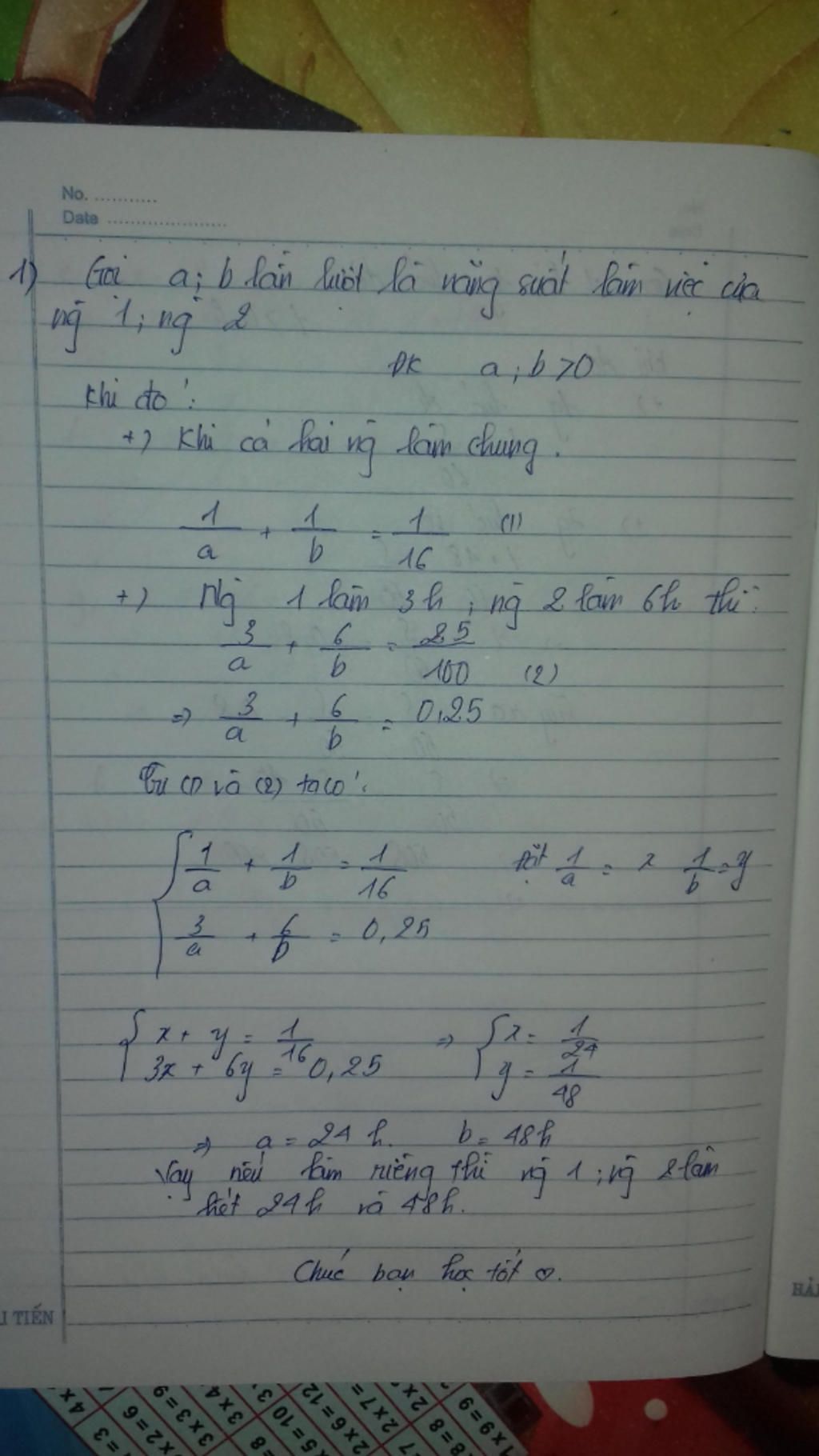 Người 1 làm 3 giờ, người 2 làm 6 giờ: `3/x+6/y=0,25`