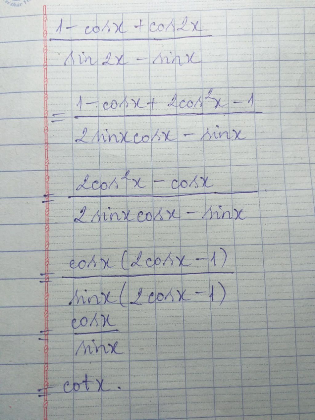 $VT=\dfrac{1-\cos x+\cos 2x}{\sin2x-\sin x}$