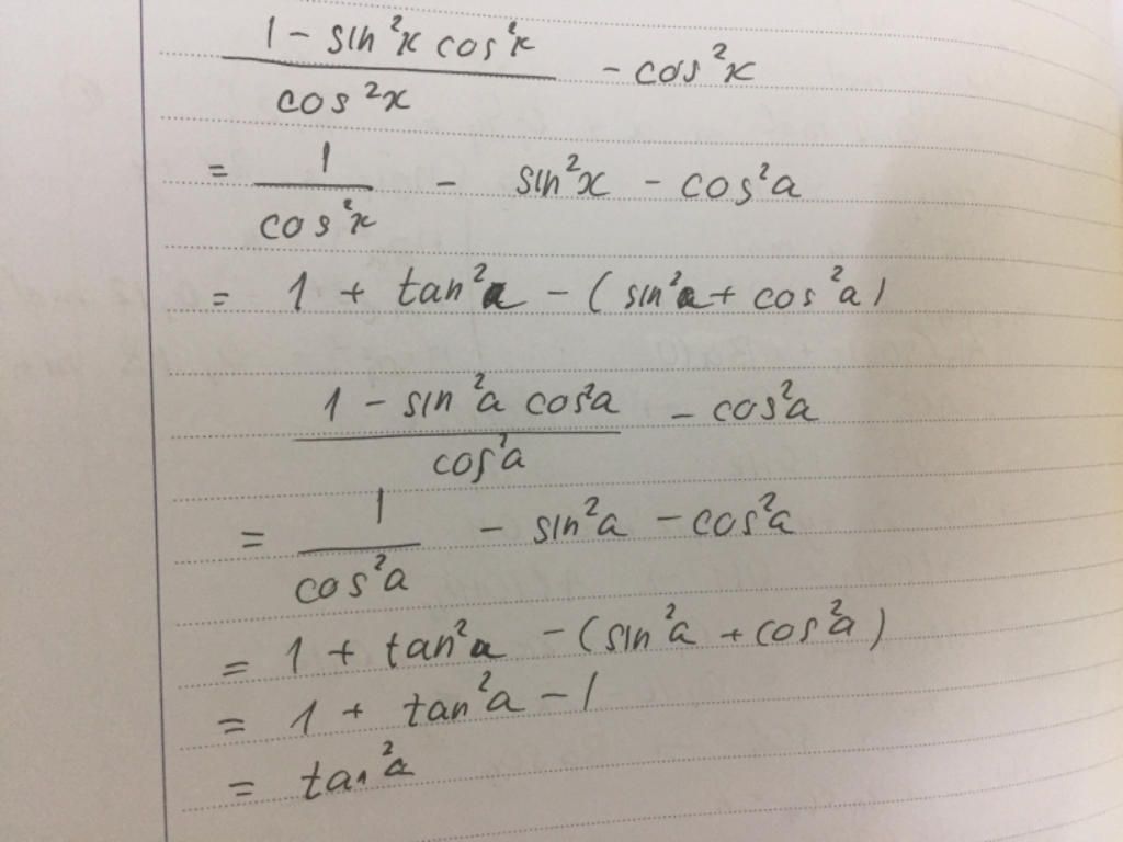 =\dfrac{ \sin^2x+\cos^2x-\sin^2x\cos^2x}{\cos^2x}-\cos^2x\\
