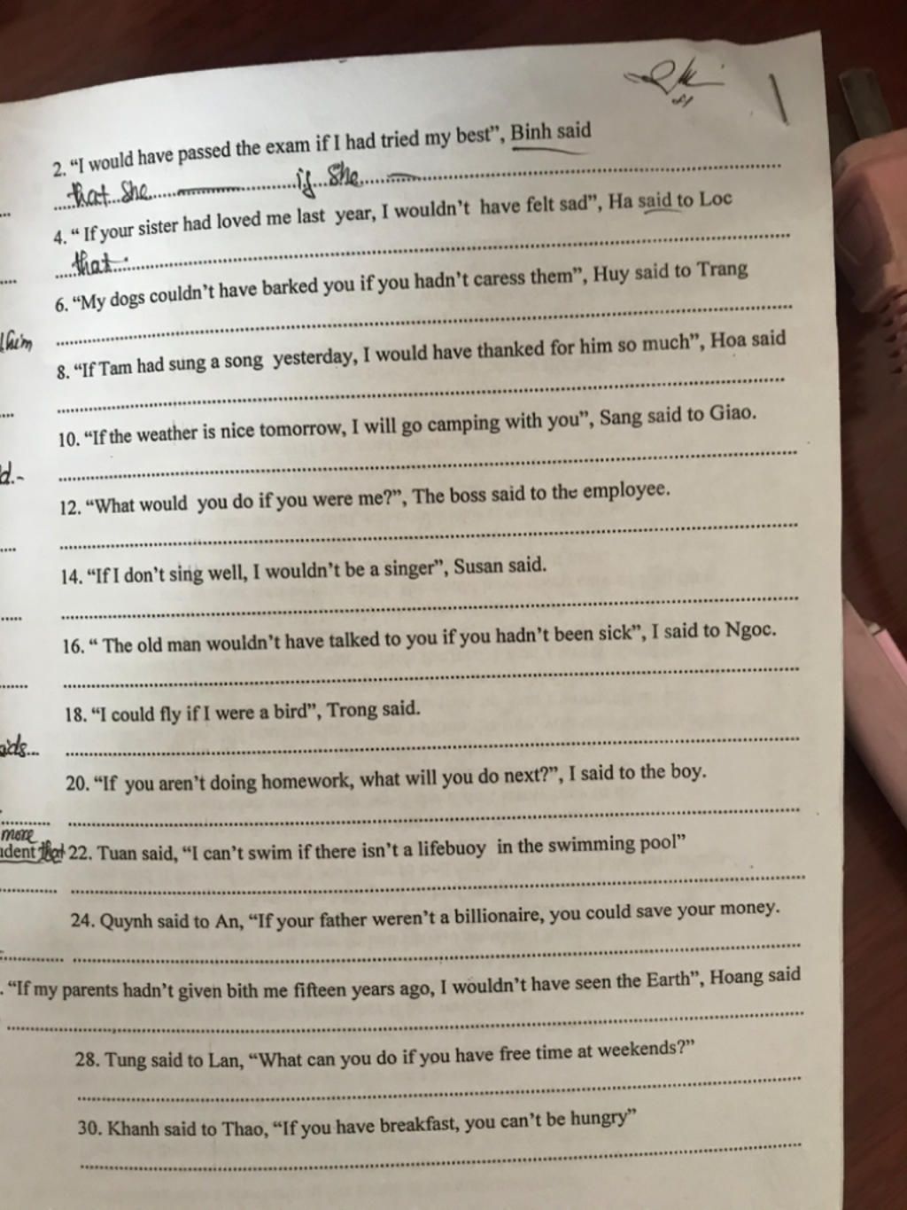 30, Khanh said to Thao that if he had breakfast, he couldn’t be hungry.