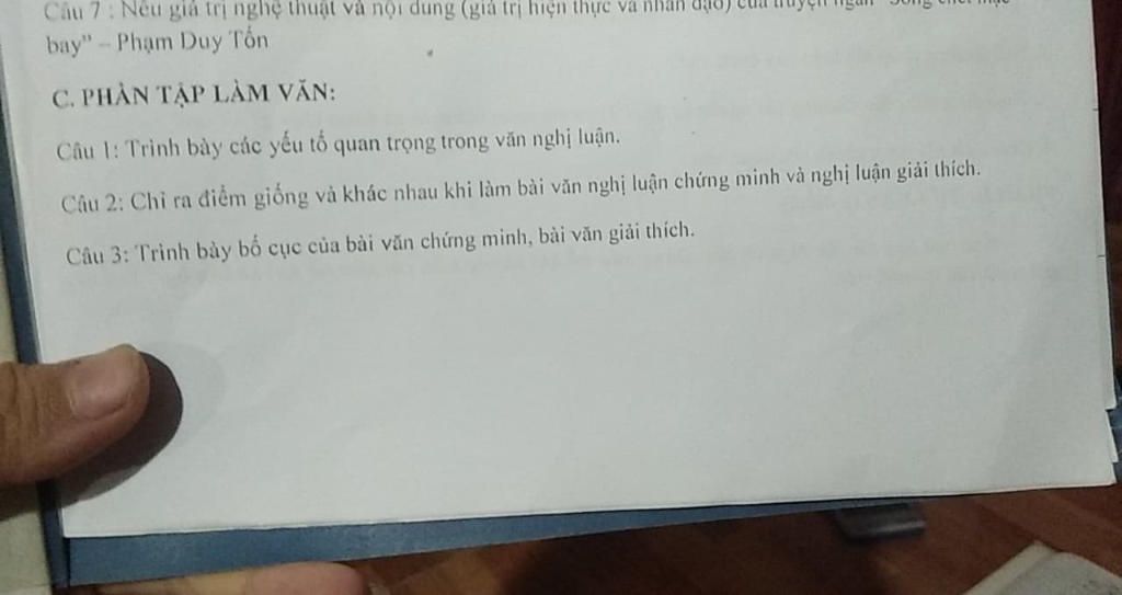 Câu 1: Trong bài văn nghị luận, phải có những yếu tố cơ bản sau