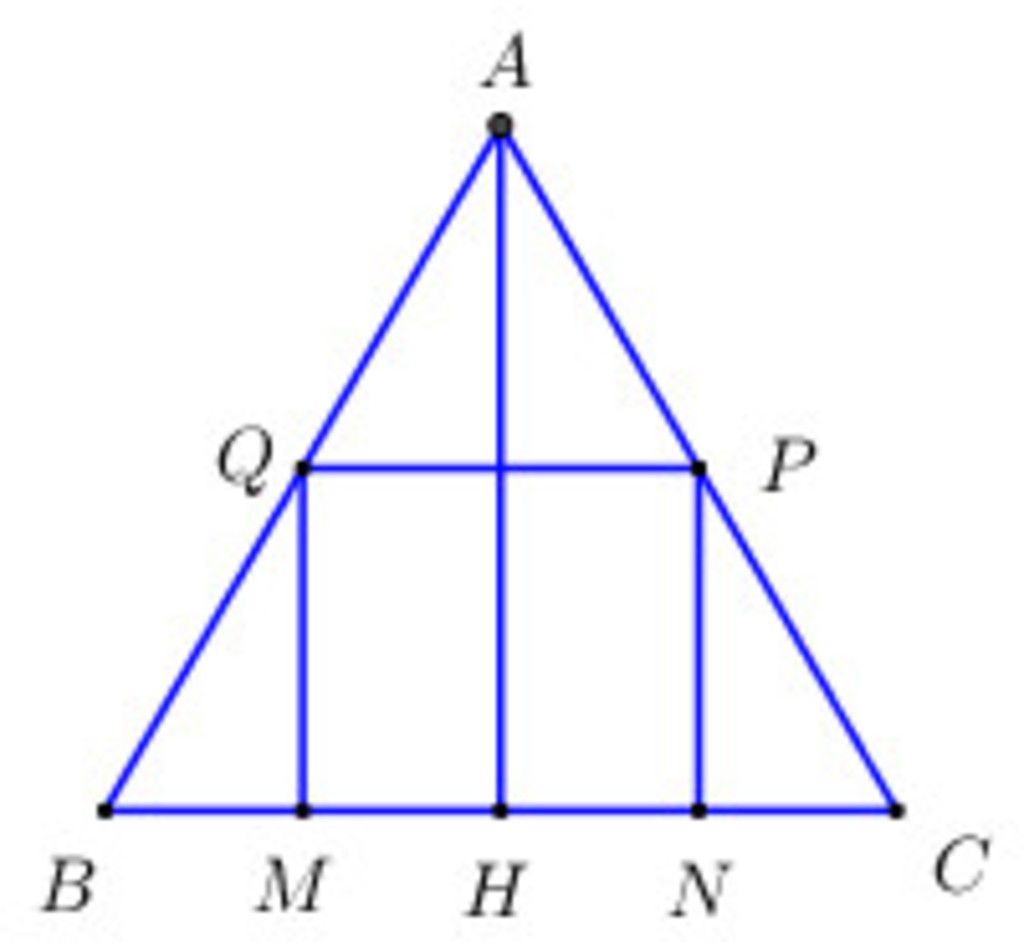$$\eqalign{ & {{MQ} \over {AH}} = {{BM} \over {BH}} \Leftrightarrow {{MQ} \over {{{a\sqrt 3 } \over 2}}} = {x \over {{a \over 2}}} \Leftrightarrow MQ = x\sqrt 3 = NP \cr & {{PQ} \over {BC}} = {{AQ} \over {AB}} = {{MH} \over {BH}} \Leftrightarrow {{PQ} \over a} = {{{a \over 2} - x} \over {{a \over 2}}} \cr & \Leftrightarrow PQ = a - 2x \cr & \Rightarrow {S_{MNPQ}} = PQ.QM = \left( {a - 2x} \right).x\sqrt 3 \cr & = - \sqrt 3 \left( {2{x^2} - ax} \right) \cr & Xet\,\,f\left( x \right) = 2{x^2} - ax \cr & f'\left( x \right) = 4x - a = 0 \Leftrightarrow x = {a \over 4} \cr & f\left( 0 \right) = 0;\,\,f\left( {{a \over 4}} \right) = - {{{a^2}} \over 8};\,\,f\left( {{a \over 2}} \right) = 0 \cr & \Rightarrow {\mathop{\rm minf}\nolimits} \left( x \right) = - {{{a^2}} \over 8} \Rightarrow {S_{MNPQ\,\,\max }} = {{{a^2}\sqrt 3 } \over 8} \cr} $$ Câu 2 bạn xem lại đề bài nhé!