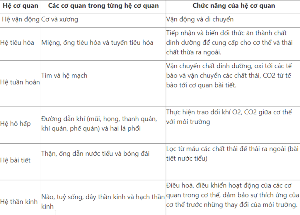 Chức năng của hệ cơ quan |