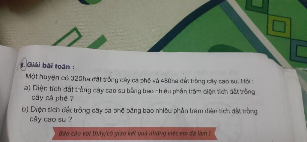 b) Diện tích trồng cây cà phê bằng số phần trăm diện tích trồng cây cao su là :