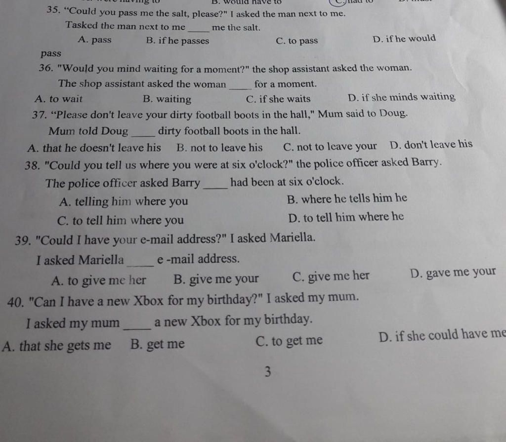 37, B – not to leave his (Mum told Doug not to leave his dirty football boots in the hall.)