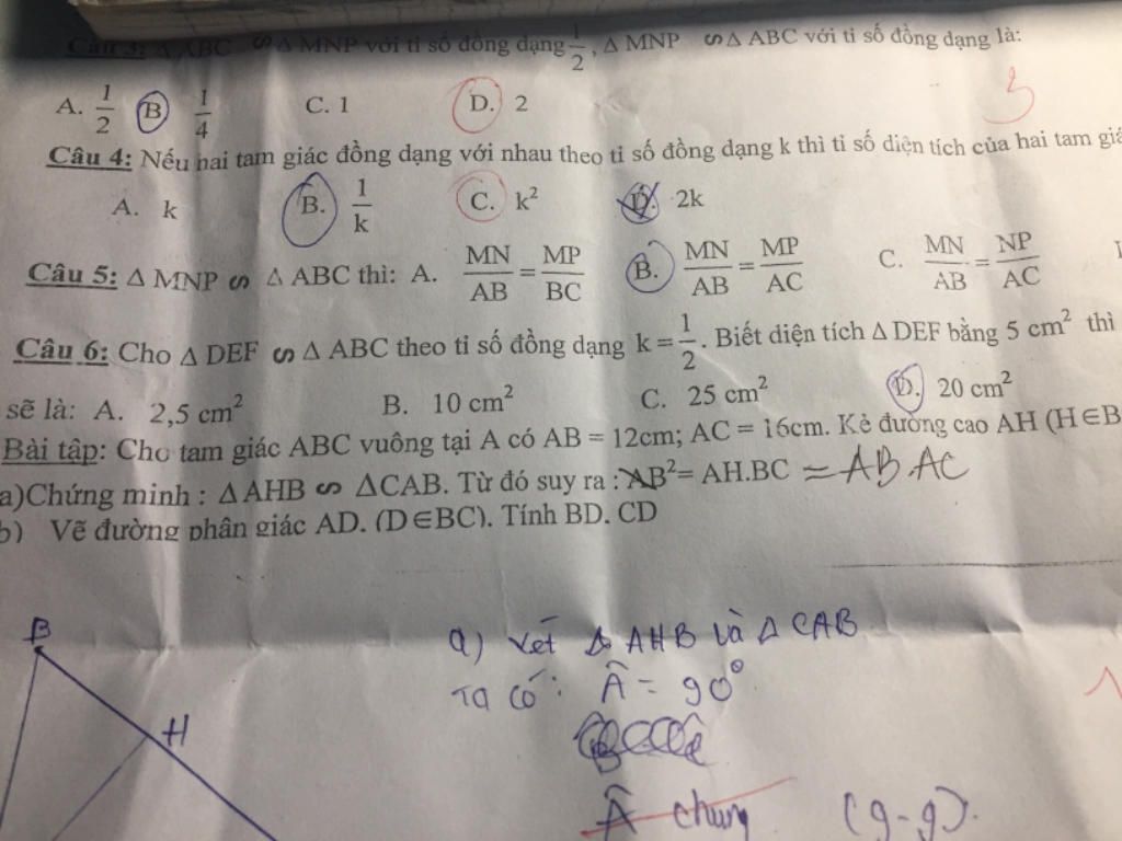 Câu 4: Nếu nai tam giác đồng dạng với nhau theo tỉ số đồng dạng k thì ti số diện tích của hai tam giề