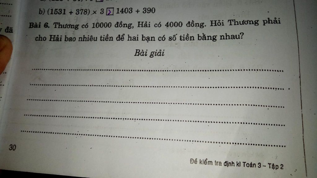 Thương phải cho Hải 2000 thì 2 bạn mới có số tiền bằng nhau