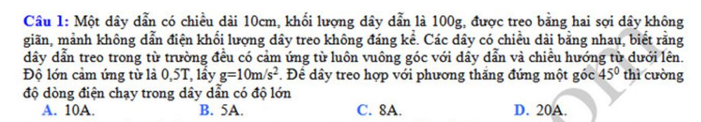 \Rightarrow \tan {45^0} = \frac{{0,5.I.0,1}}{{0,1.10}} \Rightarrow I = 20A