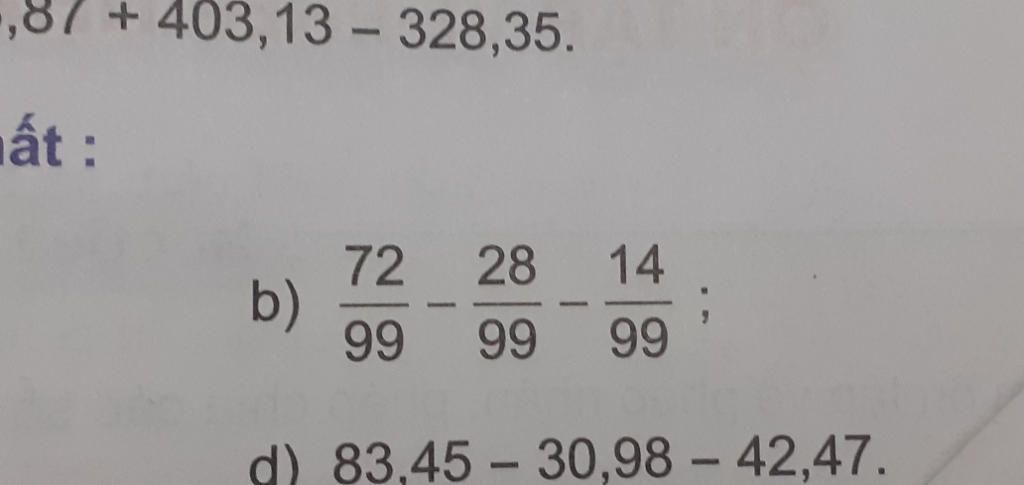 Phần b) : 72/99 - 28/99 - 14/99 = 44/99 - 14/99 = 30/99 = 10/33
