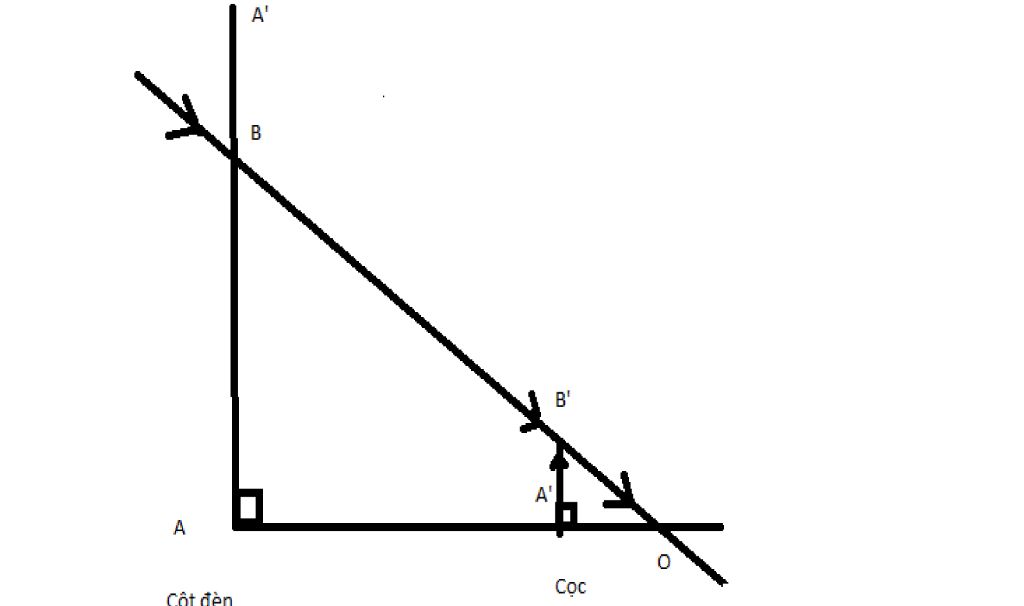 + Từ cái đỉnh của cái bóng, lấy cái bóng của cái cột đèn dài 5cm về phía chân cái cọc => Xác định được vị trí của cột đèn. Sau đó từ chân cột đèn dựng thẳng đứng lên trên cắt tia sáng mặt trời tại đầu cột đèn.