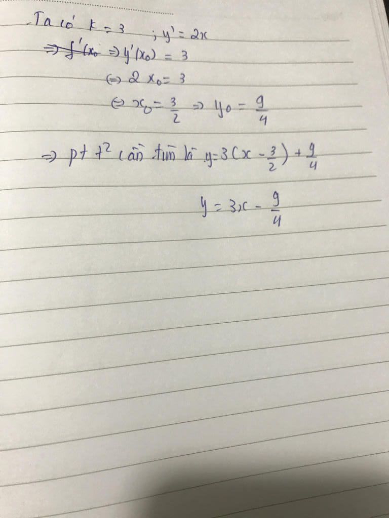 Giải thích các bước giải: khi bạn có hệ sô góc rồi bạn đạo hàm y thành y' rồi cho bằng hệ số góc rồi bạn tìm được x sau đó bạn thay vào y rồi bạn áp dụng công thức y=k(x-xo)+yo