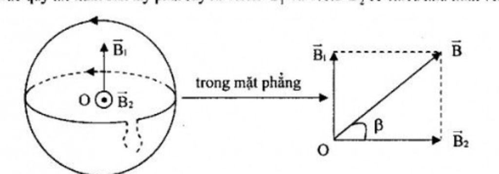 \(B = \sqrt {{B_1} + {B_2}} = \sqrt {{{({{8.10}^{ - 5}})}^2} + {{(2\pi {{.10}^{ - 5}})}^2}} = {10^{ - 4}}T\)