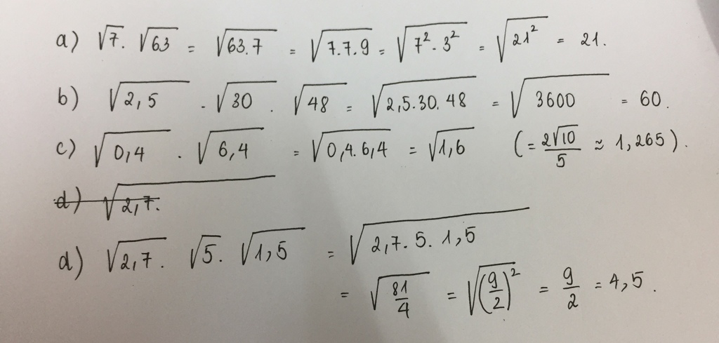 d)$\sqrt{2,7}$ .$\sqrt{5}$ .$\sqrt{1,5}$ =$\sqrt{0,3.3^{2}}$ .$\sqrt{5}$ .$\sqrt{0,3.5}$ =$\sqrt{0,3^{2}.5^{2}.3^{2}}$ =0,3.5.3=4,5