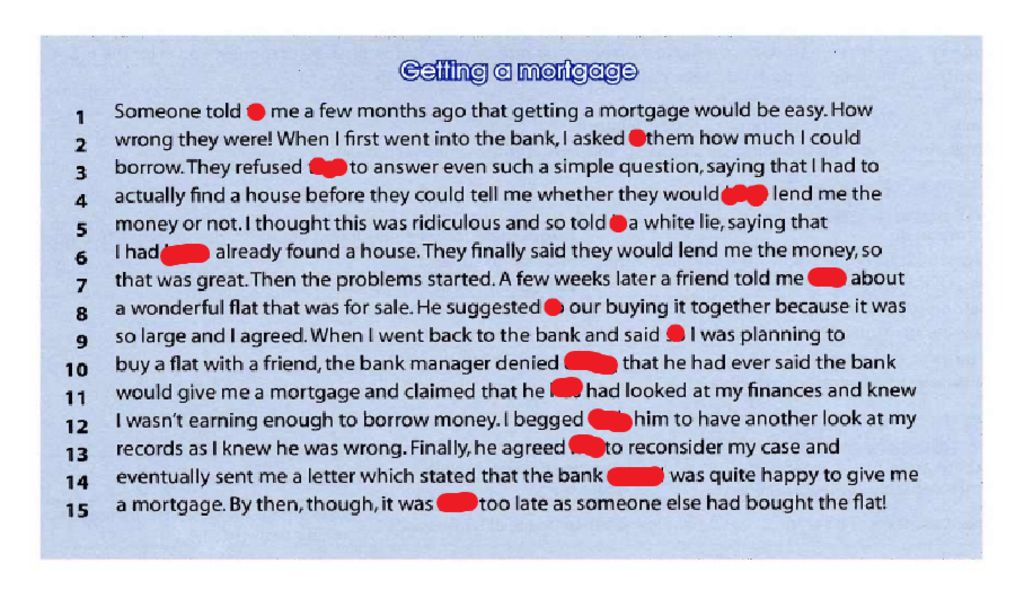 1 vài tháng trước có nguời nói với tôi rằng vay thế chấp rất dễ nhưng họ đã nhầm. Lần đâu tôi đến ngân hàng, tôi hỏi họ tôi có thể mượn bao nhiêu. Họ từ chối trả lời ngay cả câu hỏi đơn giản nhất, họ nói rằng tôi cần phải thực sự tìm được 1 ngôi nhà trước khi mà họ có thể nói về việc cho tôi vay tiền hay không. Tôi nghĩ rằng việc này thật nực tười vì vậy tôi đã nói 1 lời nói dối vô hại rằng tôi đã tìm được 1 căn nhà. Cuối cùng họ đồng cho tôi vay tiền và điều đó thật tuyệt. Và rồi vấn đề bắt đầu xuất hiện. Vài tuần sau đó, 1 người bạn của tôi nói rằng đang có 1 căn hộ rất tuyệt đang được rao bán. Anh ấy gợi ý rằng chúng tôi nên mua nó cùng nhau bởi vì căn hộ khá rộng và tôi đồng ý. Khi tôi quay trở lại ngân hàng và nói rằng tôi chuẩn bị mua 1 căn hộ cùng với 1 người bạn, giám đốc ngân hàng từ chối và nói rằng anh ta đã nói với ngân hàng cho tôi vay thế chấp và yêu cầu xem tình hình tài chính của tôi và biết rằng tôi không thể nào trả được số tiền vay. Tôi đã cầu xin anh ta xem lại hồ sơ của tôi vì tôi biết rằng anh ta đã sai. Cuối cùng, anh ta đồng ý xem xét lại vụ của toi và cuối cùng gửi cho tôi 1 bức thư tuyên bố rằng ngần hàng rất vui khi cho tôi vay thế chấp. Nhưng lúc đó đã quá muộn, 1 người khác đã mua căn hộ mất rồi.