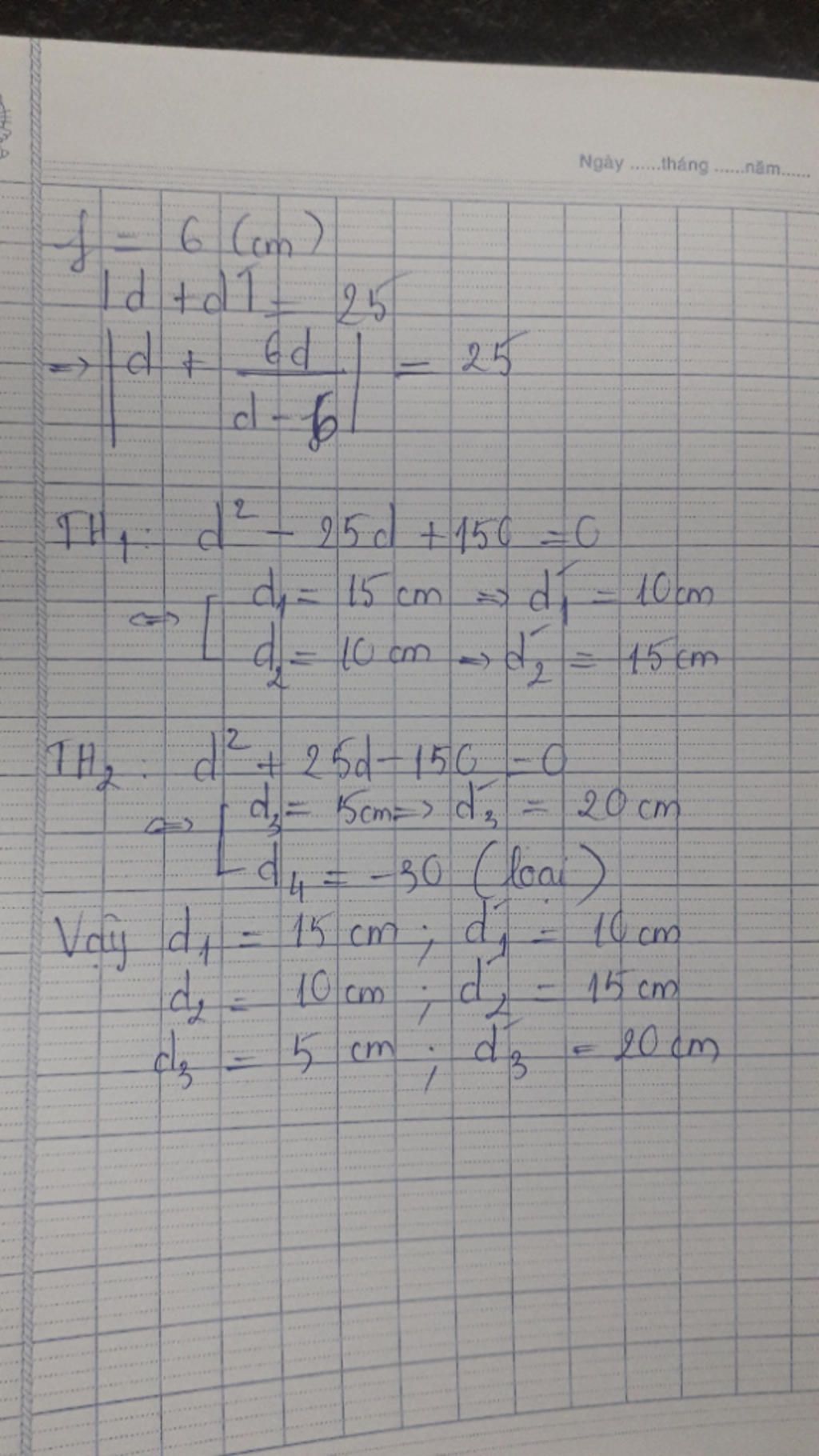 $\left\{ \begin{array}{l}f = 6cm\\L = d + d' = 25cm\end{array} \right.$ (1)