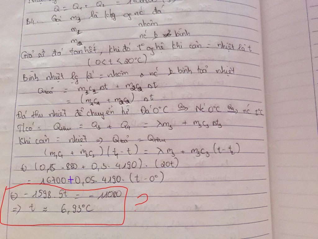 \( \Leftrightarrow (0,3.4190 + 0,15.880).(20 - t) = 1670 + 0,05.4190.(t - 0) \Rightarrow t = 16,{3^0}C\)