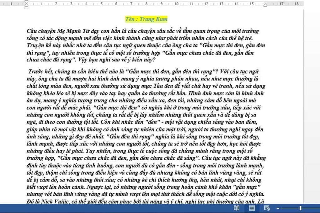 Ca dao, tục ngữ Việt Nam rất giàu đẹp và mang nhiều tầng lớp ý nghĩa khác nhau, Cũng vì thế, mà tục ngữ được sử dụng rất phổ biến trong cuộc sống của chúng ta. Nó đề cập đến nhiều vấn đề khác nhau. Câu tục ngữ: ''Gần mực thì đen, gần đèn thì rạng'' của nhân dân ra thời xưa đã đưa ra lời khuyển về chuyện là những thứu xung quanh cũng ảnh sẽ ảnh hưởng dến phẩm chất và cuộc sống của ta.