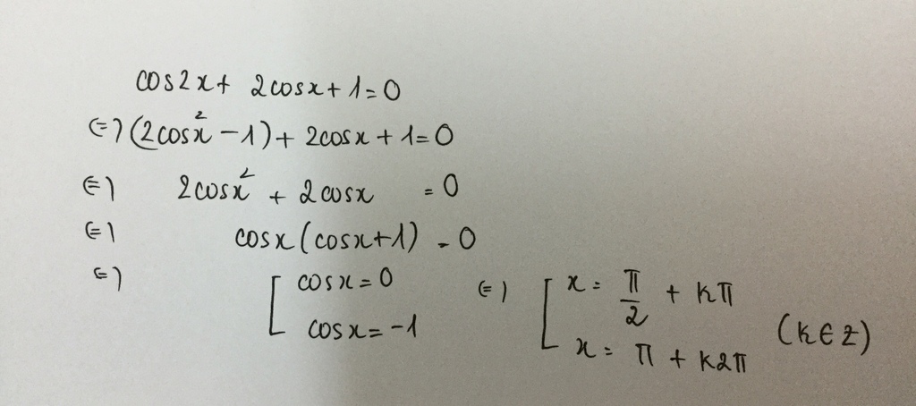 $$\eqalign{ & \cos 2x + 2\cos x + 1 = 0 \cr & \Leftrightarrow 2{\cos ^2}x + 2\cos x = 0 \cr & \Leftrightarrow 2\cos x\left( {\cos x + 1} \right) = 0 \cr & \Leftrightarrow \left[ \matrix{ \cos x = 0 \hfill \cr \cos x = - 1 \hfill \cr} \right. \Leftrightarrow \left[ \matrix{ x = {\pi \over 2} + k\pi \hfill \cr x = \pi + k2\pi \hfill \cr} \right.\,\,\left( {k \in Z} \right) \cr} $$