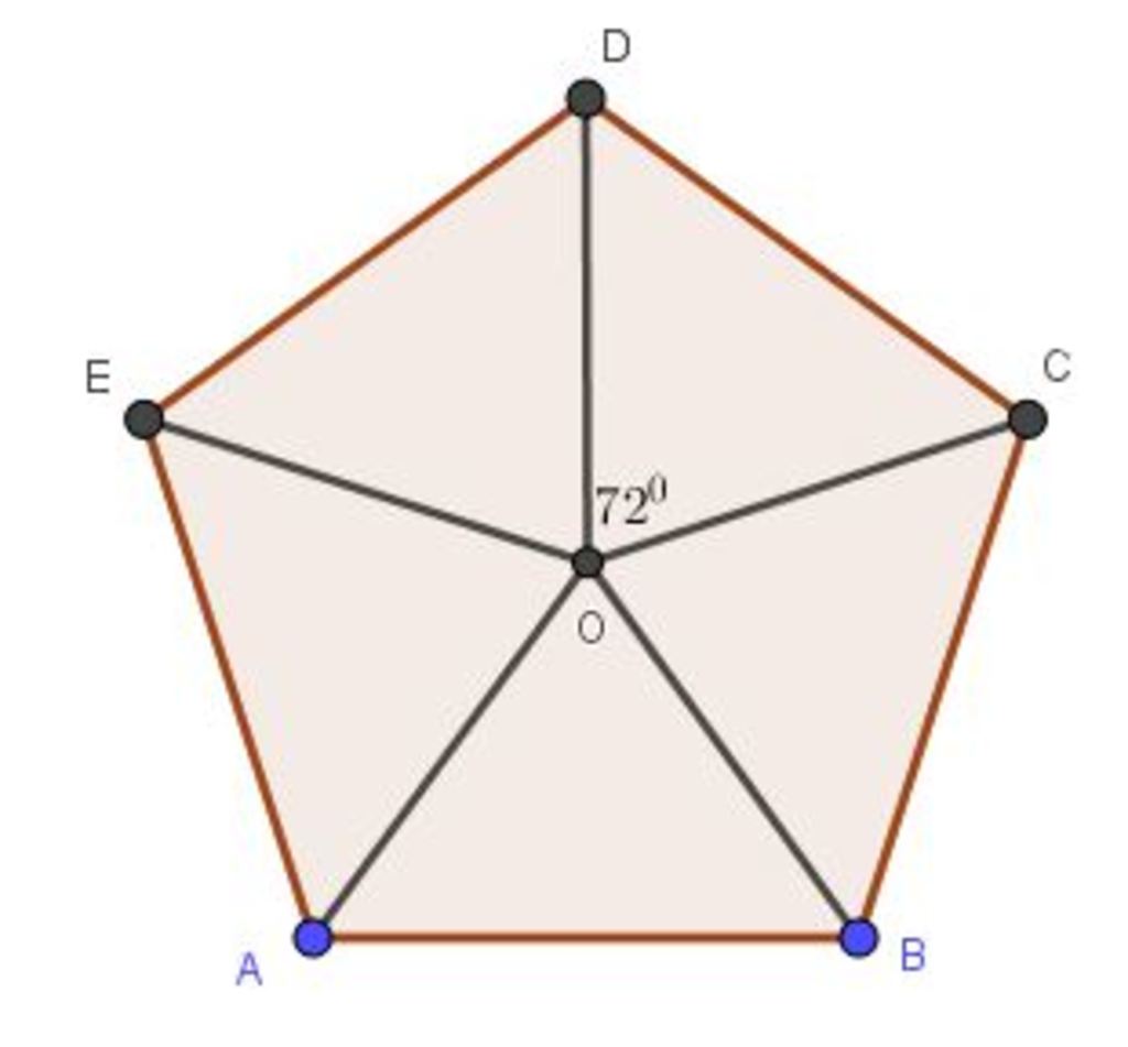 1) Dễ thấy \(\widehat {AOB} = \widehat {BOC} = \widehat {COD} = \widehat {DOE} = \widehat {EOA} = \dfrac{{{{360}^0}}}{5} = {72^0}\)