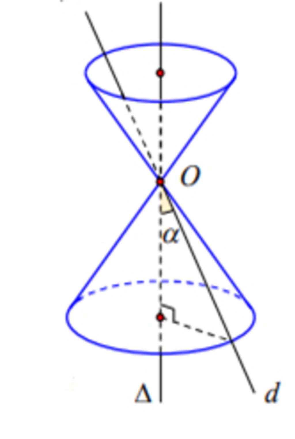 Cho mặt phẳng (P), hai đường thẳng $d,\Delta$ cắt nhau tại $O$, và tạo thành góc $\alpha(0^o<\alpha<90^o)$. Khi quy mặt phẳng $(P)$ xung quanh $\Delta$ thì đường thẳng $d$ sinh ra một mặt được gọi là mặt nón tròn xoay (gọi tắt là mặt nón)