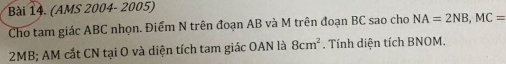 Nên suy ra: SABM = SNBC mà hai tam giác này có chung phần diện tích là diện tích hình NOMB nên S AON = S OMC = 8 (cm2)