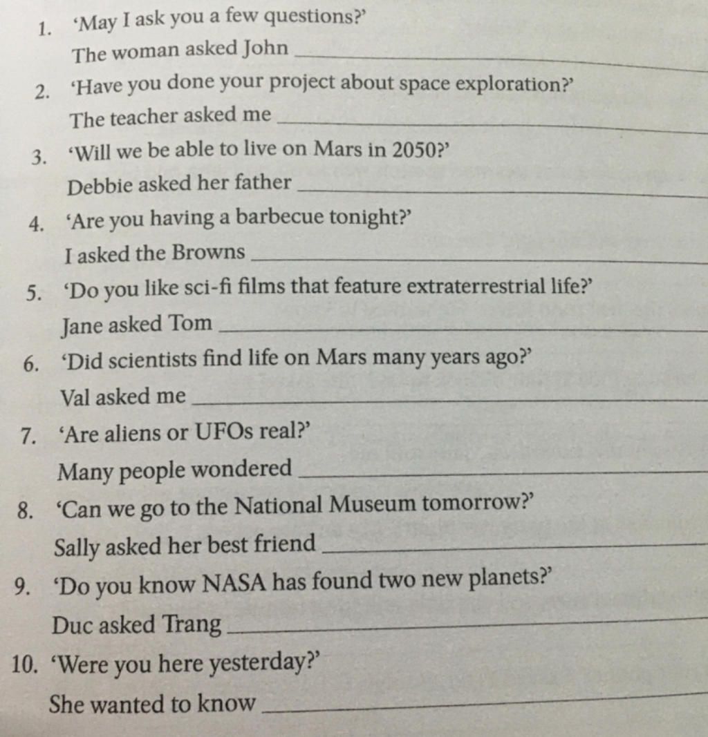 2. The teacher asked me if I had done my project about space exploration.