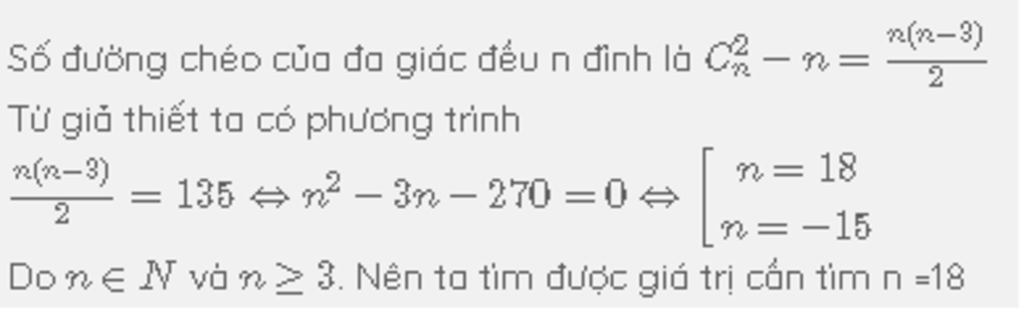 $\rightarrow \dfrac{n.(n-3)}{2}=135\rightarrow n^2-3n-270=0\rightarrow (n+15)(n-18)=0\rightarrow n=18$