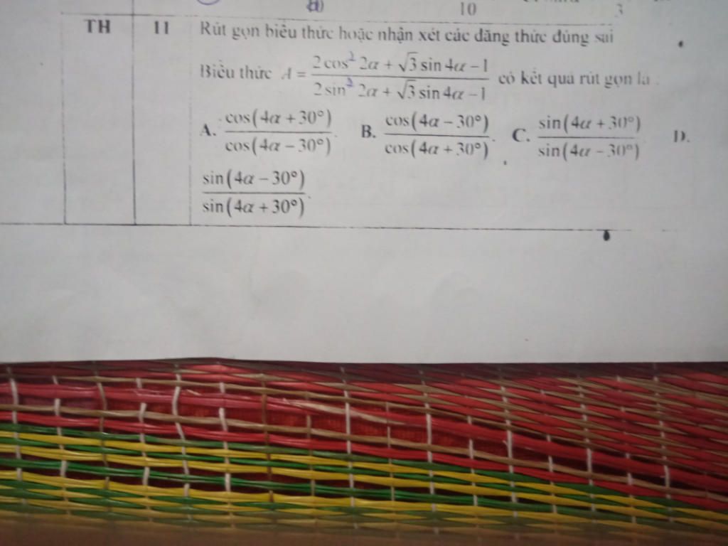 = \dfrac{{\dfrac{{\sqrt 3 }}{2}\sin 4a + \dfrac{1}{2}\cos 4a}}{{\dfrac{{\sqrt 3 }}{2}\sin 4a - \dfrac{1}{2}\cos 4a}}\\