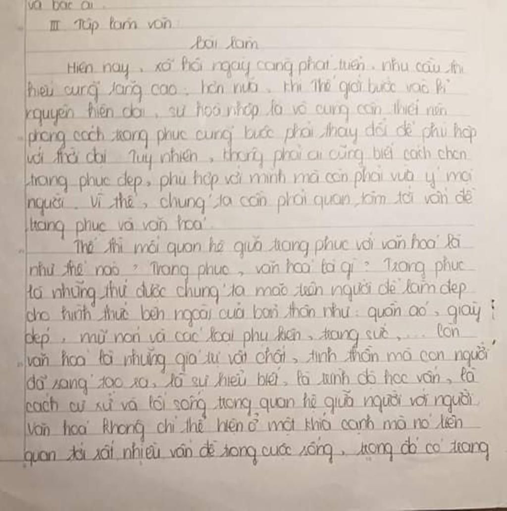 Dù biết mặc dồi đúng lứa tuổi và hợp với truyền thống dân tộc là đúng vậy mà vẫn cnf nhiều bạn làm trái với điều này . Các bạn ấy dù nhỏ tuổi nhưng lại mặc những bộ đồ hỡ hang không phù hợp với truyền thống , các bạn ấy còn chê bai phong cách các bộ đồ truyền thống của dân tộc các bạn ấy thật đáng trách . Ý thước được việc mặc đồ đúng lứa tuổi và theo văn hóa truyền thống là tốt là học sinh chúng ta hãy biết chọn cách chọn đồ phù hợp với bản thân , ngoài ra chúng ta phải giữ gìn truyền thống bằng cách mặc những bộ đò phù hợp với văn hóa , không đua đòi thời đại