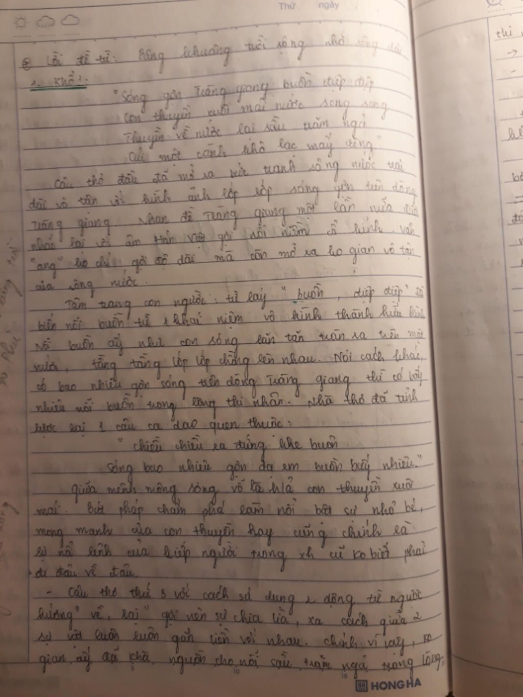 Ví dụ: Một trong những nhà thơ mới nổi tiếng là nhà thơ Huy Cận, mỗi bài thơ mang một phong cách rất riêng. Thơ của Huy Cận mang phong cách thơ hàm súc, triết lí và phục vụ cho cách mạng của nước ta. Một trong những tác phẩm thơ nổi tiếng là Tràng giang, bài thơ nằm trong tập thơ Lửa thiêng. Bài thơ thể hiện cảnh thu 1939, bài thơ được sáng tác khi tác giả nhìn bên bờ sông Hồng dưới dòng nước mênh mông sóng nước. Đặc sắc nhất là khổ thơ cuối của bài thơ Tràng giang. Chúng ta cùng đi tìm hiểu khổ thơ cuối của bài thơ để hiểu rõ về phong cách thơ của Huy Cận.
