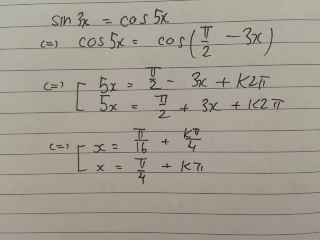 <-> $3x = \pi/2 - 5x + 2k\pi$ hoặc $3x = \pi - (\pi/2 - 5x) + 2k\pi$