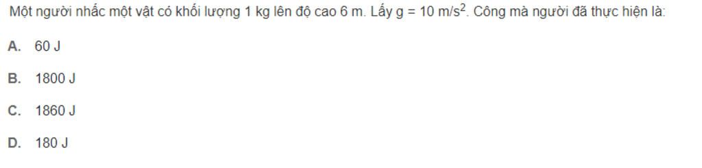 A = F × s × cos ∝ ⇒ A = 10 × 6 × cos 0 ⇒ A = 60J